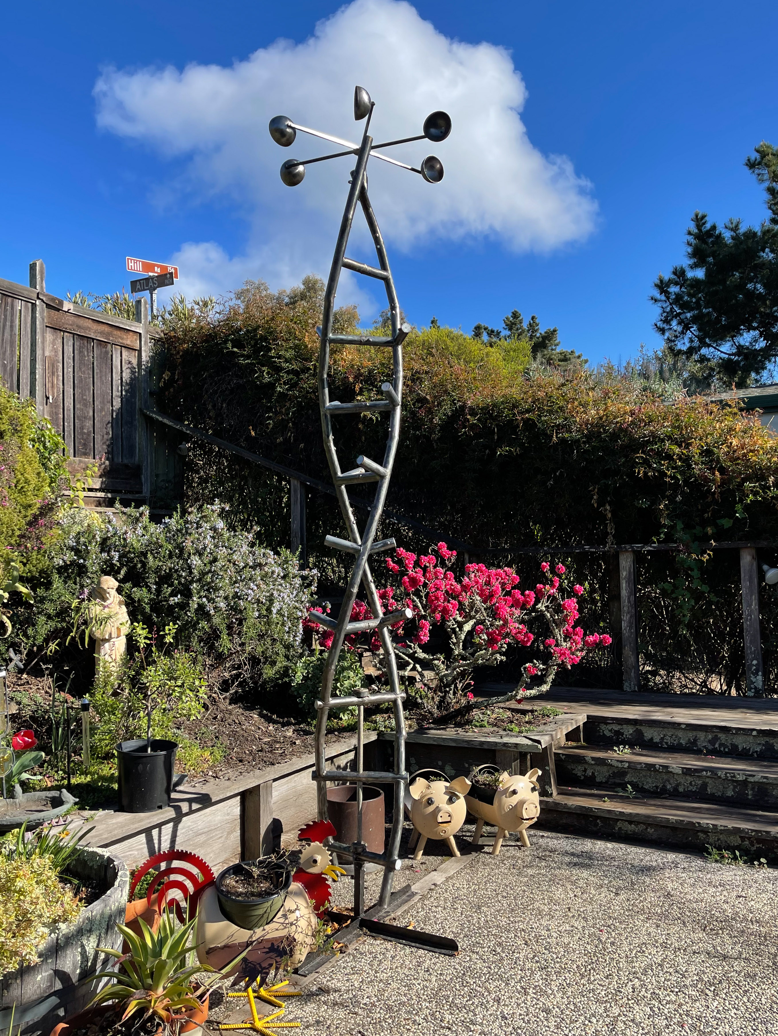 The double helix stands 9 feet high and is made from 20 discarded UST tent-canopy fittings. Mounted on ball bearings, it rotates when the wind blows.