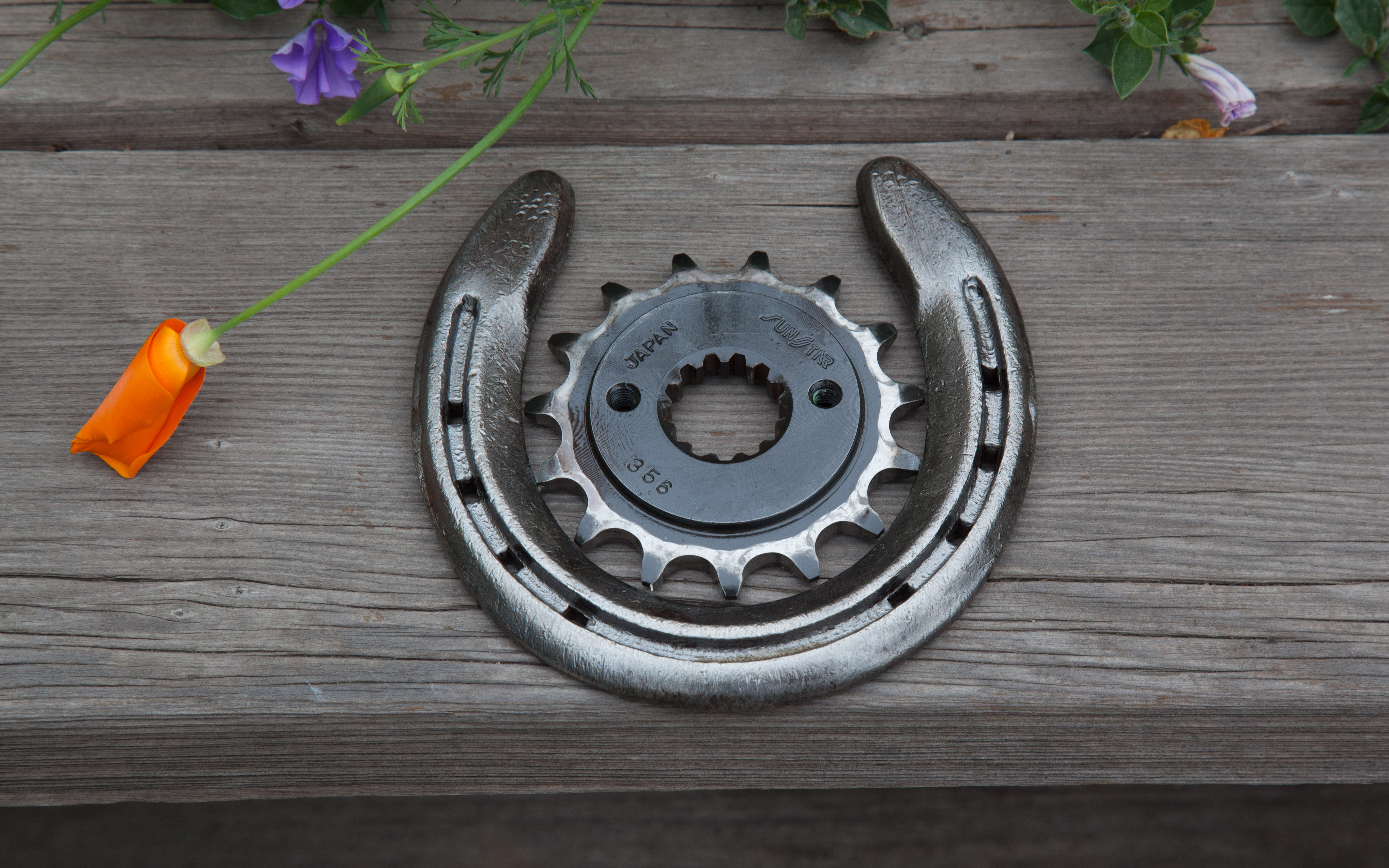 | These sprockets are from my 1995 HOnda XR600R dirtbike. Each year, before a ride in Baja I would install a new set of sprockets and new chain. I saved the old parts, not knowing at the time that they would be put to good use years later. 002-20150527_RGS_2776.jpg |
