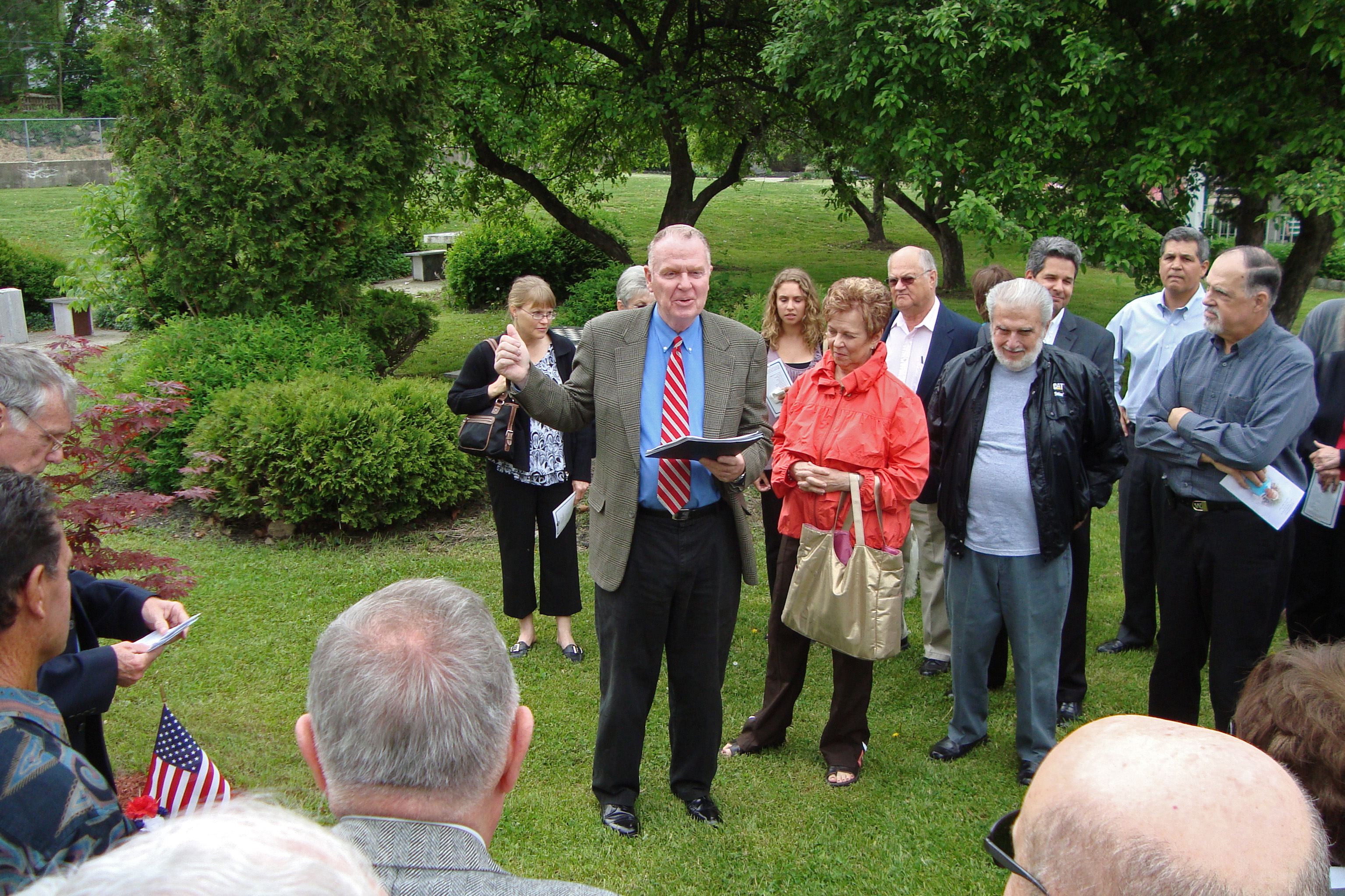 The tree and plaque are on the green across from the Library. Here, Dick Schaab points to where our old school building once stood. Along side Dick are our classmate Bev and Barbara's husband, Joe Parente. Behind Dick are Tony's daughter-in-law, Janet, his granddaughter, Chelsea, and sons Tony Jr. and Greg. |