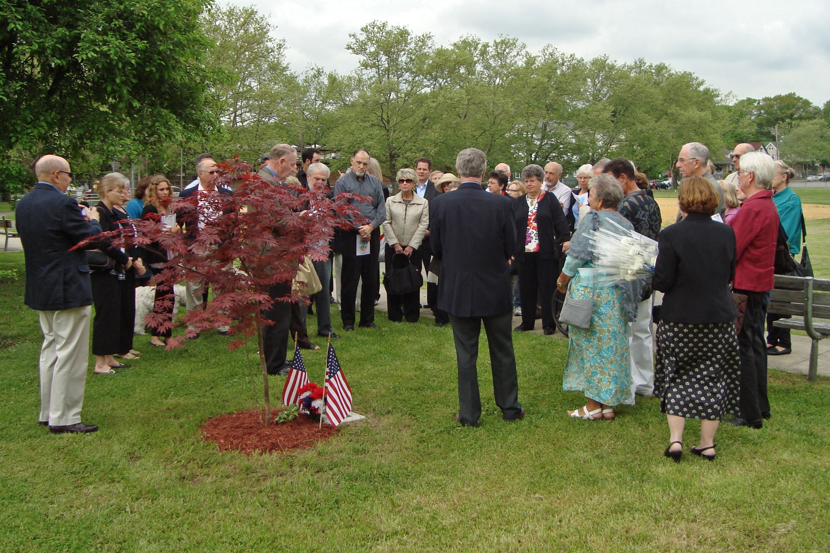 The tree and memorial plaque along with classmates, family and friends who were present for the dedication.