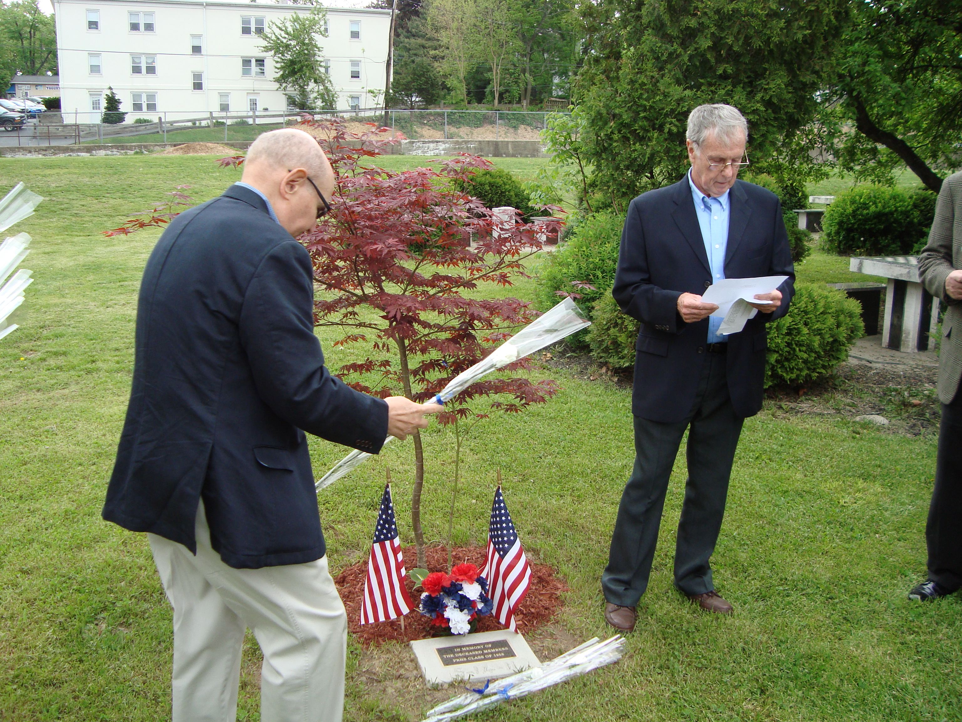 As Tom reads the name of one of our deceased classmates, Gene places a flower by the plaque.