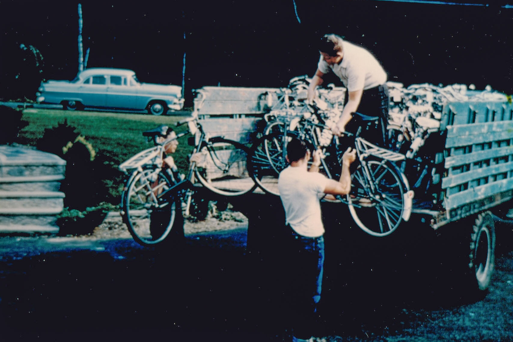 The start of the trip. David Katt and Al Fischbein loading bikes on the truck to take them to the ship.
