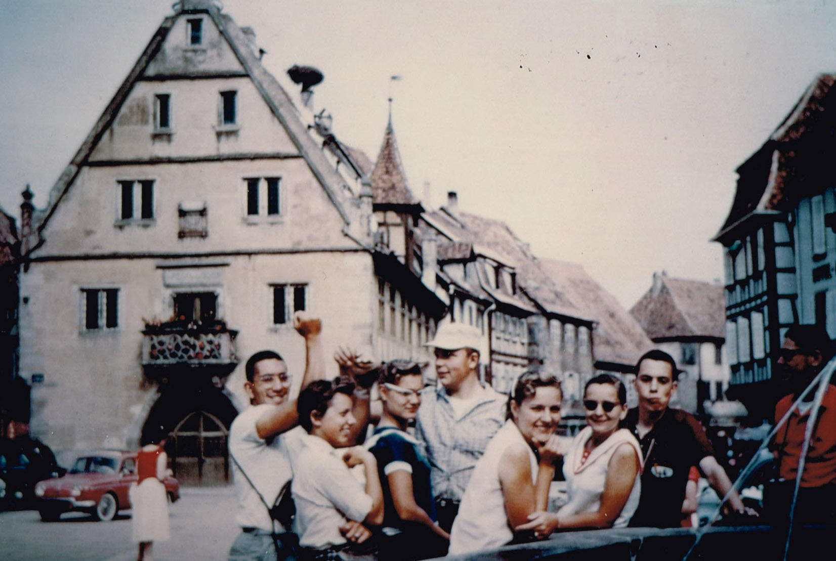 Germany, or in France near the German Border. Note the stork's nest on the roof. l.t.r. Al Fischbein, Jane Holmsen, Helene Pawlicki, David Katt, Judy Frederick, Roberta Tinurelli, David Honigstock.